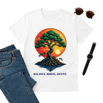 Find strength in roots, balance in branches A towering tree rooted deep in glowing waters Twin suns and cosmic sky reflect harmony For the grounded souls who grow tall Nature s wisdom in wearable art.